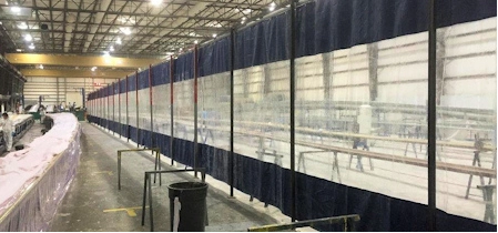 晟科工业帘™生产的推拉隔离帘,采用可组装拆卸的框架,加上顶部的铝合金导轨,使用PVC材质的防护帘组成四面围的封闭式区域,这些尺寸是按需定制的,可以根据现场布局的细节尺寸,以及不同的现场使用环境,决定框架是否需要喷塑,PVC防护帘厚薄等。通用的样式一般为PVC基布上下双层,中间使用PVC透明帘/焊接帘。这种样式,美观牢固,洁净密封,轻质实用。